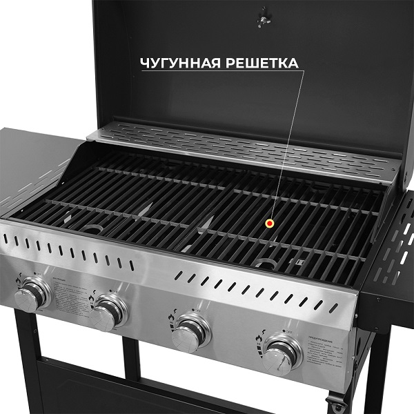 Одним из ключевых преимуществ гриля является прочная чугунная решетка с рабочей площадью 71×42 см — на ней удобно одновременно готовить разные блюда. Встроенный термостат позволяет точно поддерживать температуру, обеспечивая равномерную прожарку и идеальный результат.