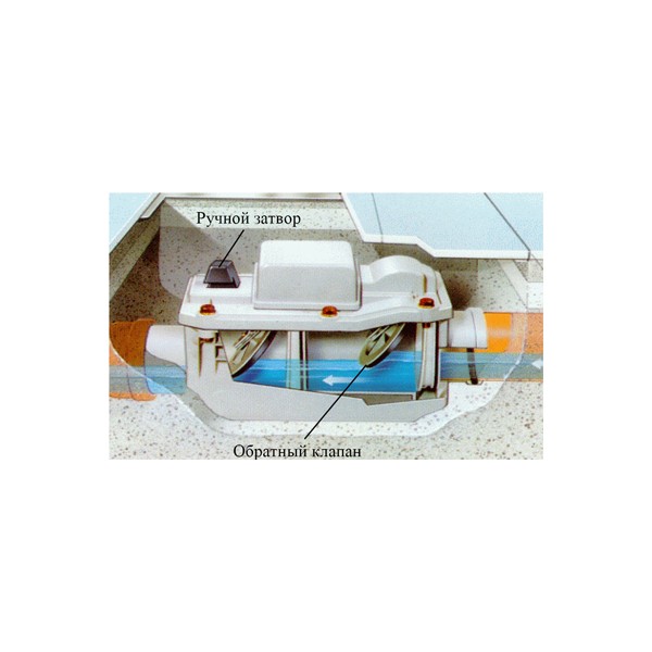 Обратный клапан имеет две рабочие камеры с запирающими их заслонками. Одна из заслонок имеет ручной привод с ревизией.