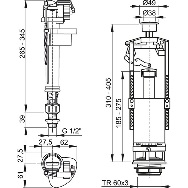 Арматура однокнопочная, имеет нижний узел подключения диаметром 1/2, латунная резьба.
