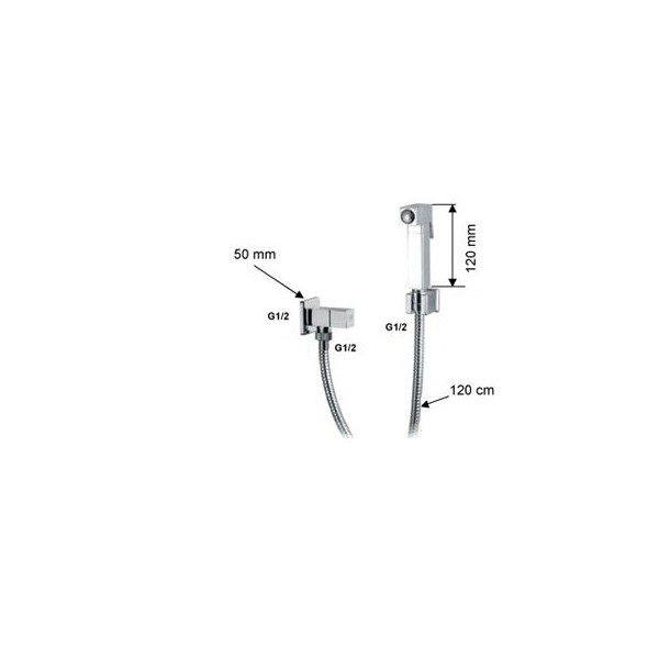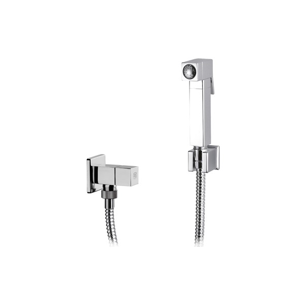 Комплект состоит из лейки, шланга длиной 120 см, углового крана с керамической вентильной головкой, отражателя и кронштейна все комплектующие изготовлены из латуни и покрыты хромированным напылением.
