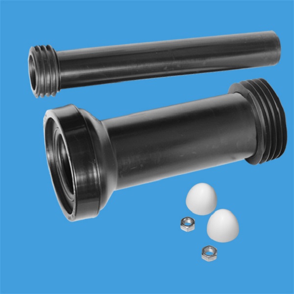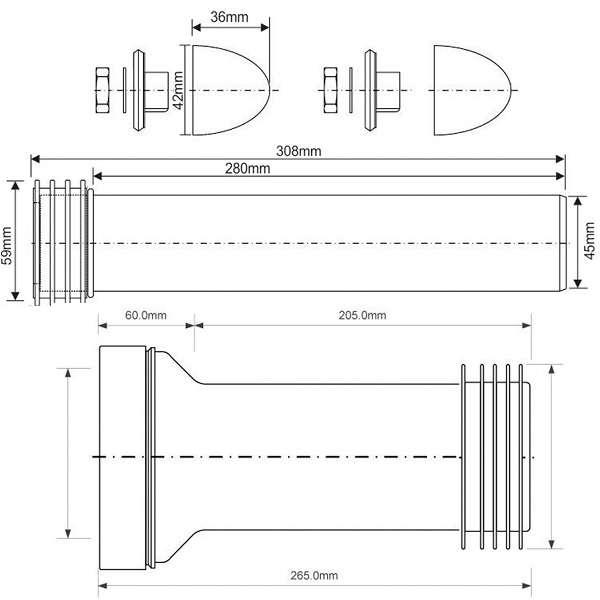 Переходный соединительный элемент с прокладкой (L304мм; вход/выход=45/59мм) для инсталяций с крепежными гайками, белыми декоративными заглушками и фановой трубой (L265мм; выход Дн=90-110мм)