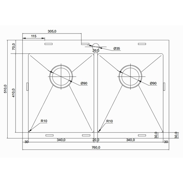 Размеры чаш: 340*410*205 мм, глубина чаш: 200 мм.