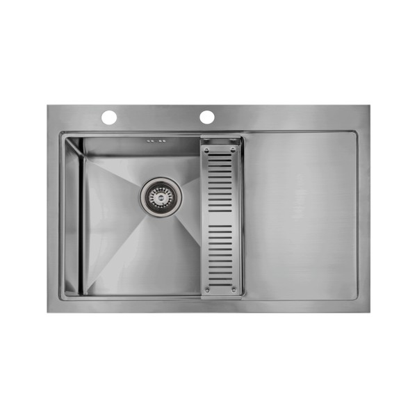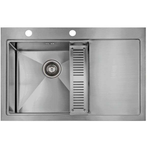 Врезная прямоугольная кухонная мойка выполнена из нержавеющей стали, идет с внутренним бортиком для корзин. Шумоподавляющие накладки. В комплекте: выпуск, сифон с переливом, крепежи.