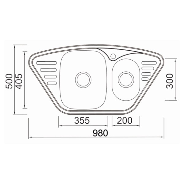 Мойка, имеющая форму трапеции, идеально впишется в угловую тумбу с размерами 900 х 900 х 600 мм, а также подойдёт для прямого шкафа шириной от 800 мм.