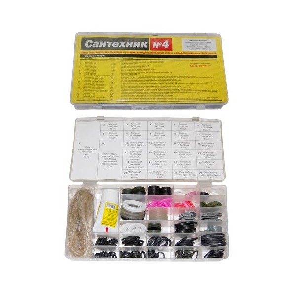 В комплект Набора прокладок Сантехник №4 РОССИЯ входят более 200 прокладок и прочих необходимых в ремонте вещей.