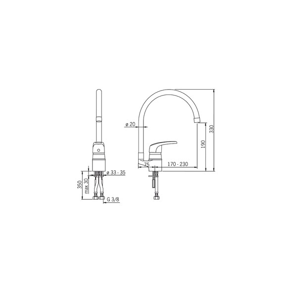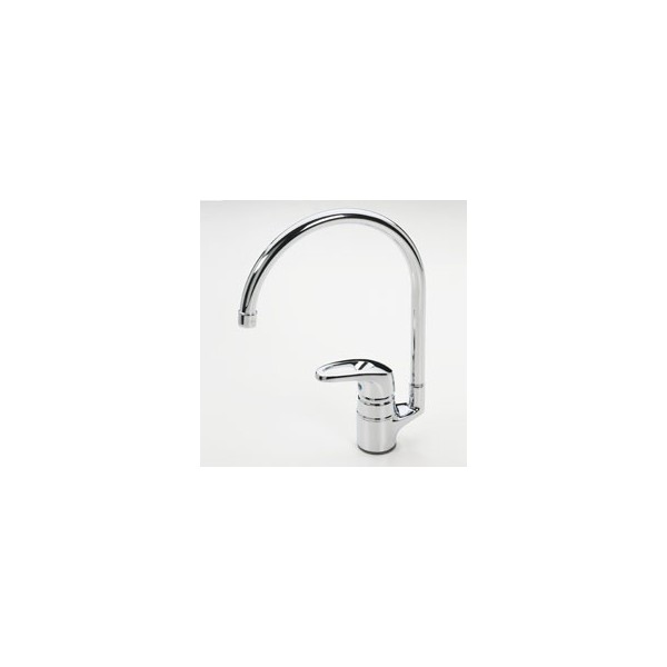 Смеситель для кухни с высоким поворотным изливом. Угол поворота излива 120º, может быть изменен. Двухкомпонентная прочная рукоятка обеспечивает удобство использования. Встроенные опции ограничения температуры и напора воды.F = Гибкая подводка