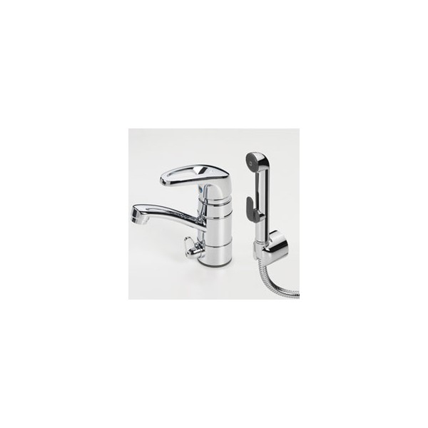 Cмеситель для умывальника с клапаном для посудомоечной машины и ручным душем Bidetta с поворотным изливом. Угол поворота излива 100º (заводская установка), может быть изменен. Клапан для посудомоечной машины с подводом холодной воды. Двухкомпонентная прочная рукоятка обеспечивает удобство использования.Встроенные опции ограничения температуры и напора воды.