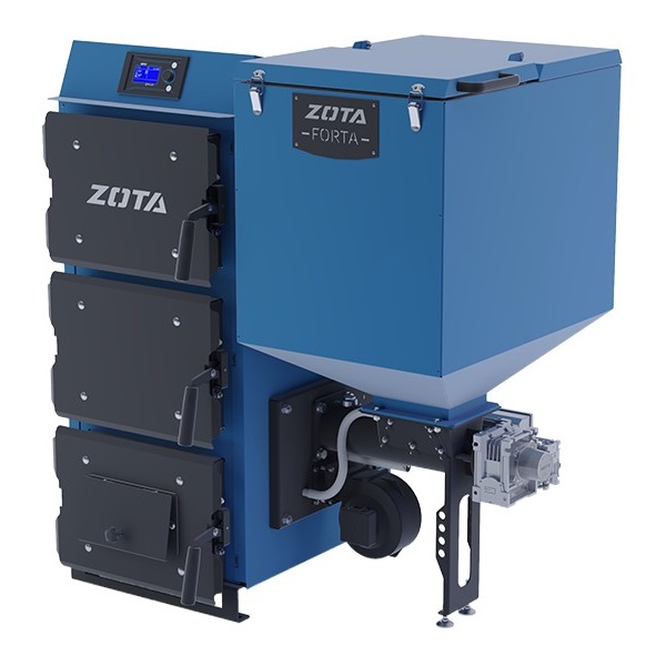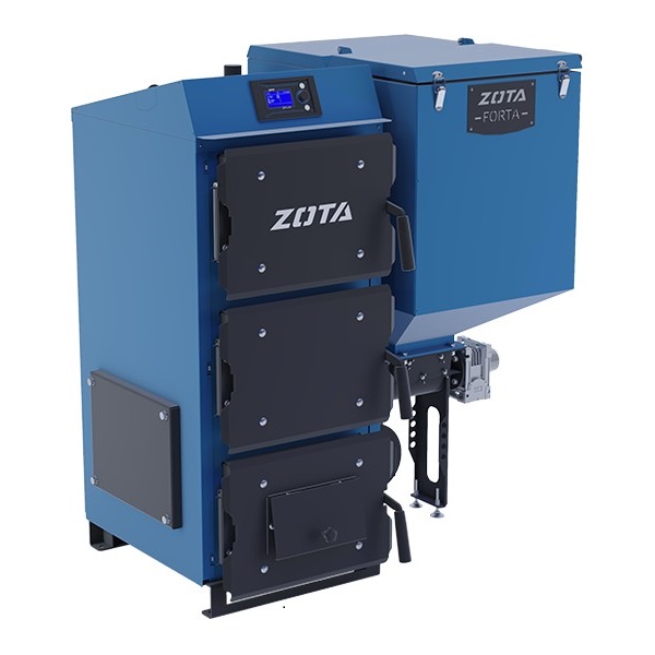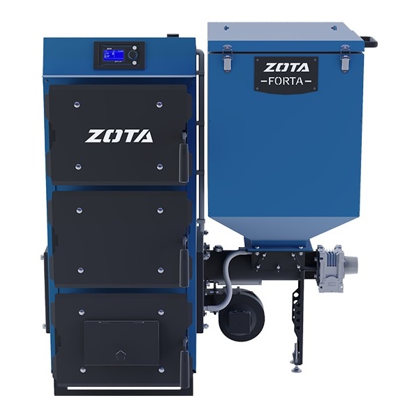 Твердотопливный котел Forta 12 Zota — это компактный отопительный котёл с автоматической подачей топлива, ручным розжигом и факельной горелкой. Forta 12 предназначен для систем водяного отопления помещений и горячего водоснабжения с помощью бойлера косвенного нагрева. Механизм подачи топлива двухшнековый, что обеспечивает пожаробезопасность котла. Котёл Forta 12 от Zota имеет малые габариты, что позволяет разместить его даже в небольшой котельной или вспомогательном помещении.